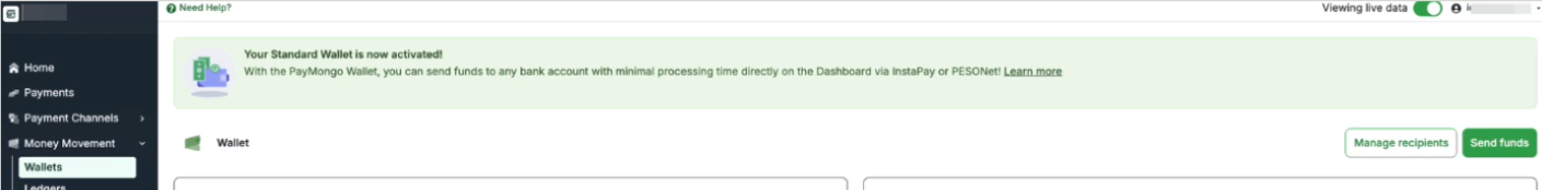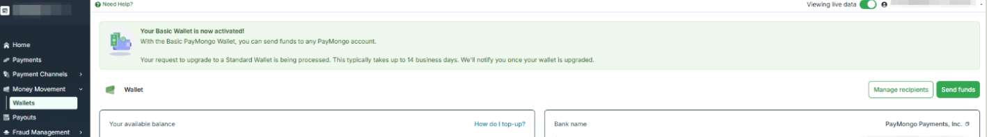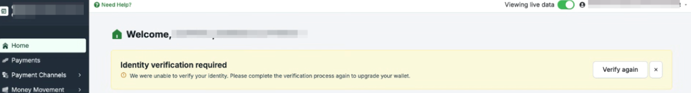 In the case your Liveness Check failed and needs to be performed again, you’ll see this banner in your PayMongo home page. Please make sure to perform it again in order to unlock your PayMongo Standard Wallet.