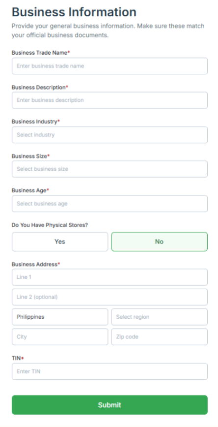 - Submit the required documents based on the business account selected. Business Document Requirements