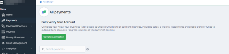 - Navigate to Payments tab in the side panel. Click on Complete Verification.
