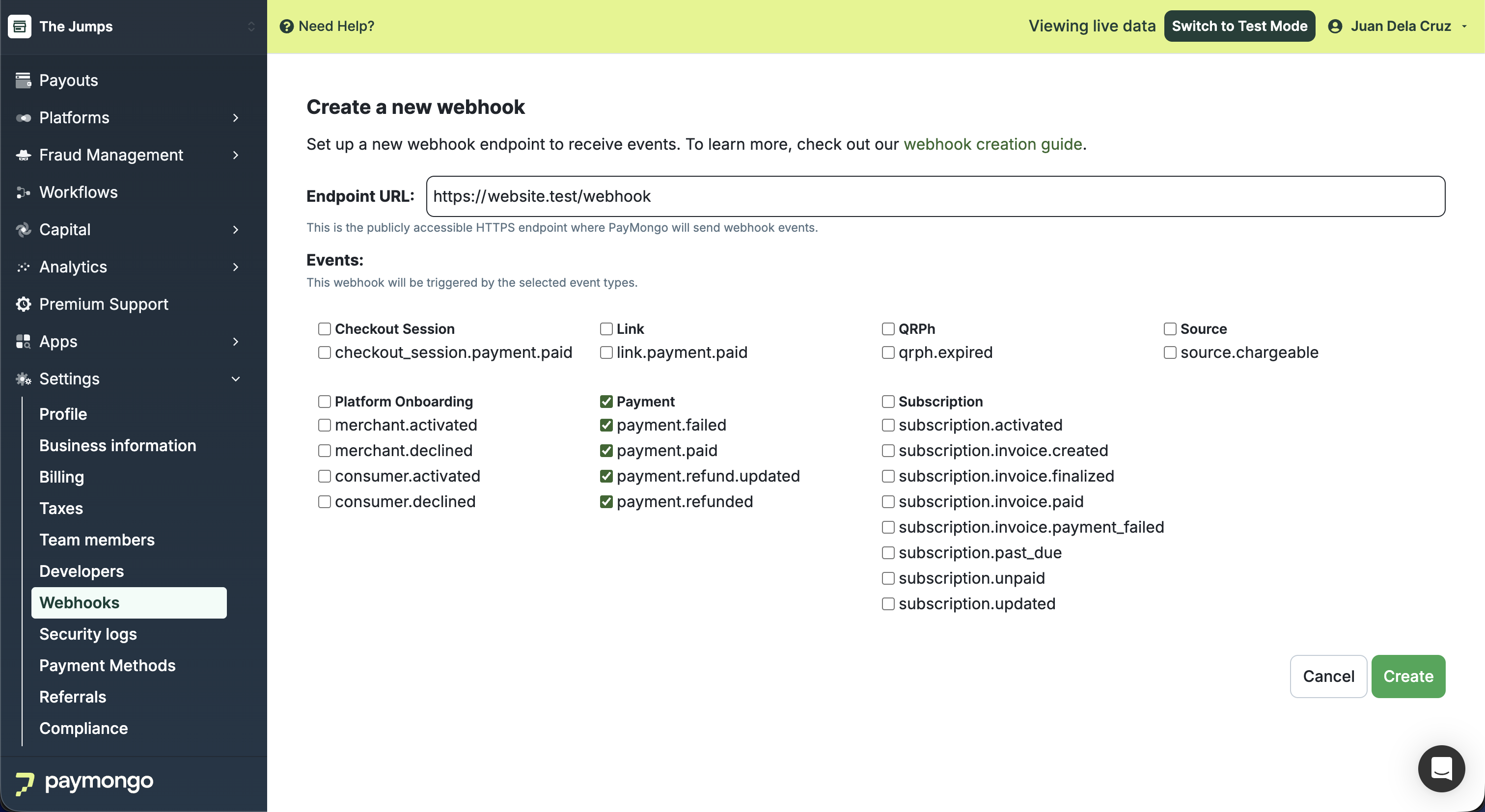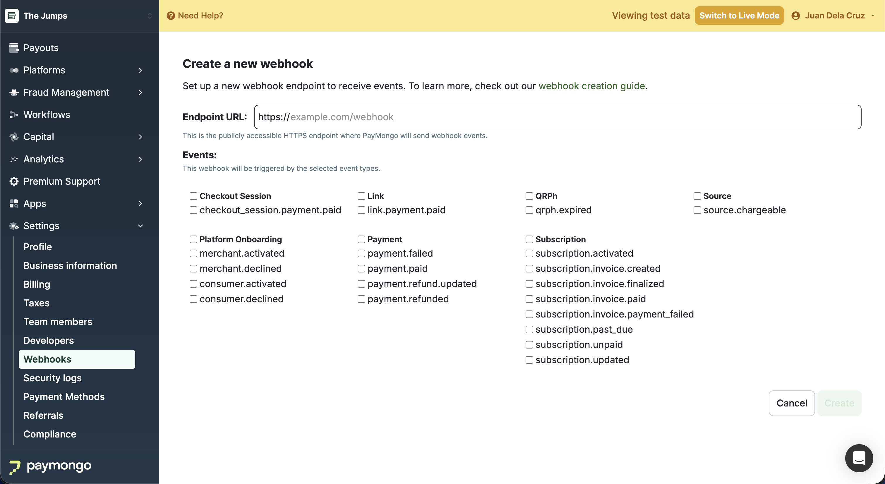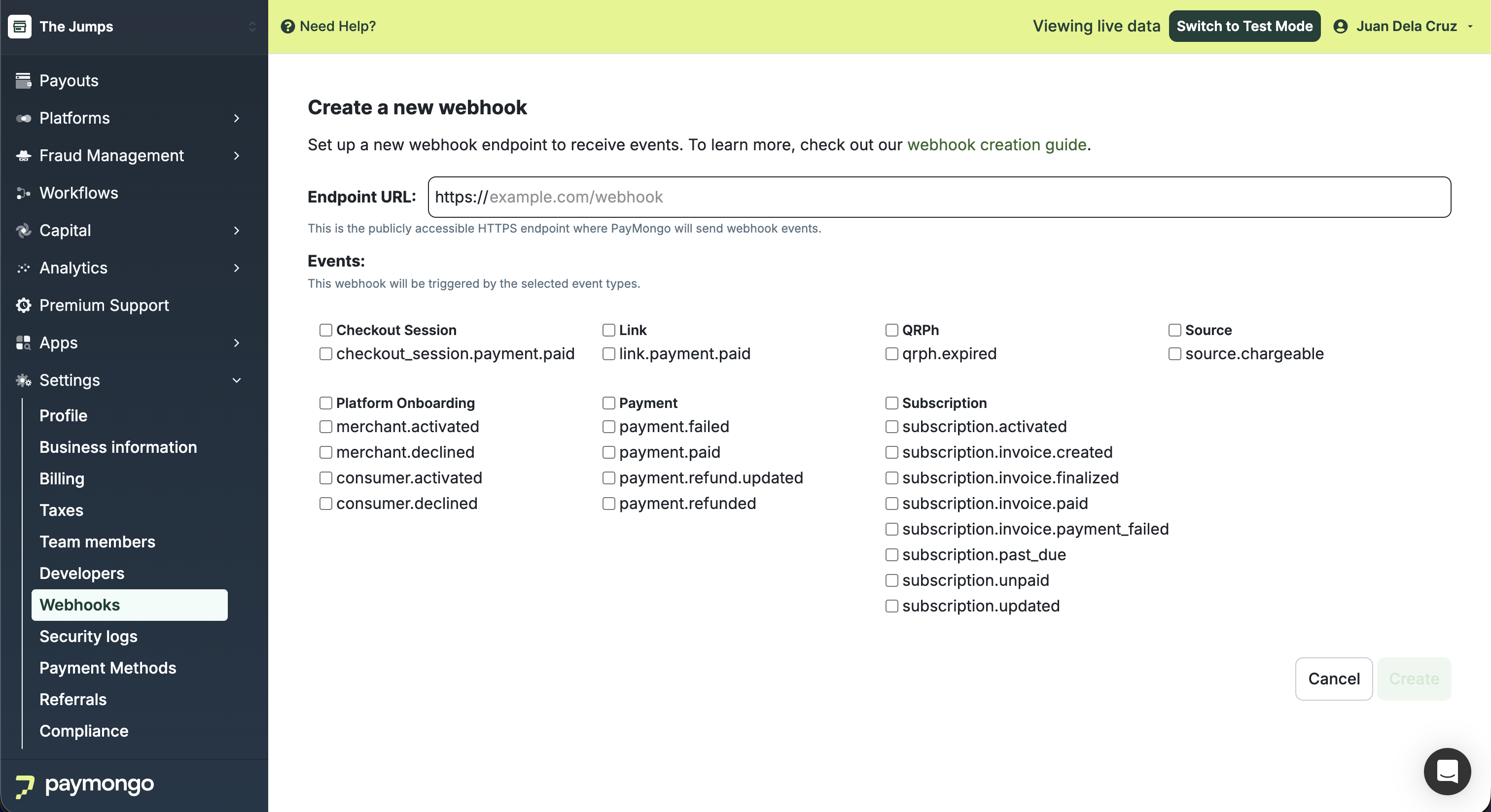 Create a new webhook and subscribe to events from the PayMongo Dashboard