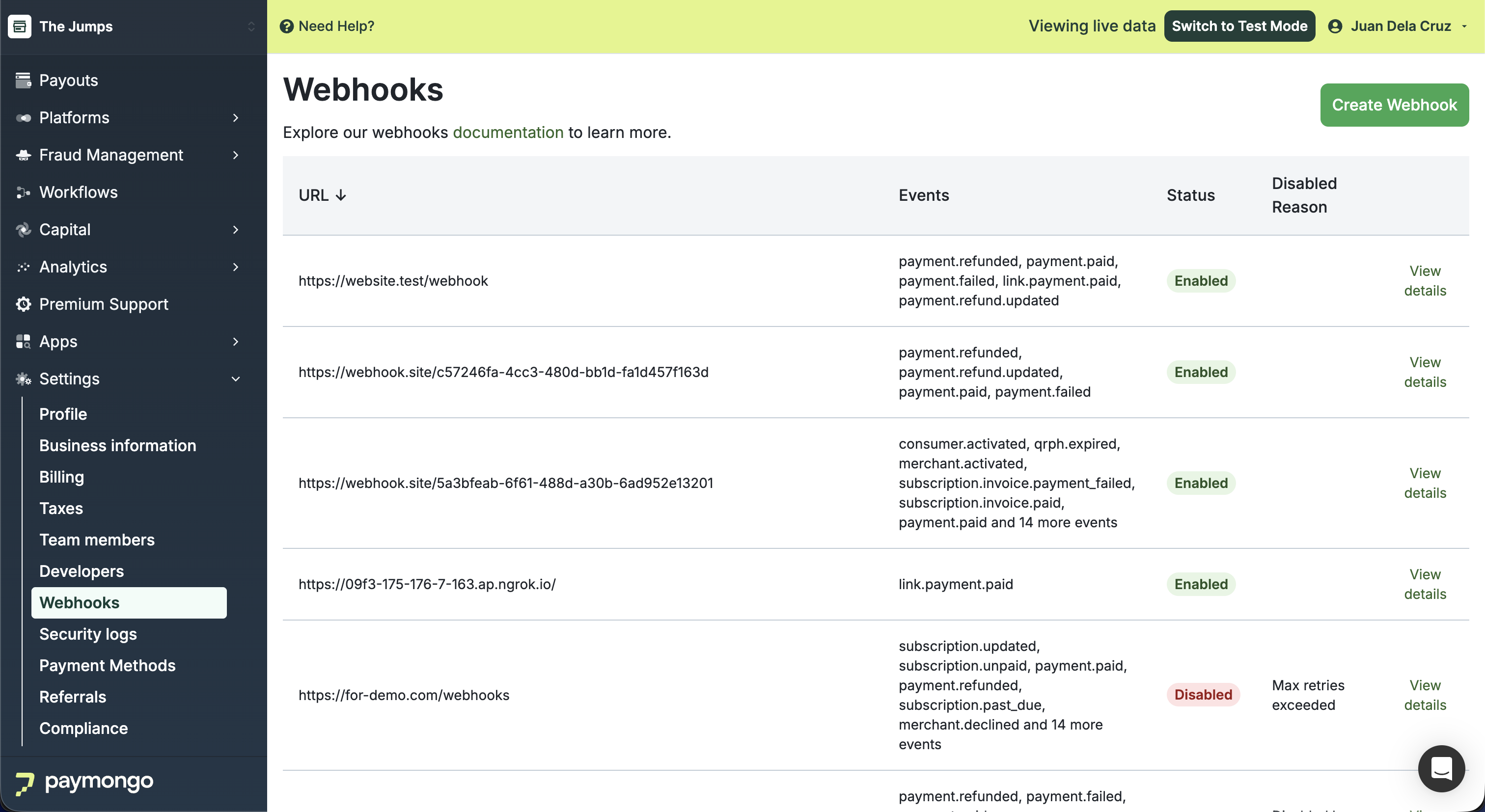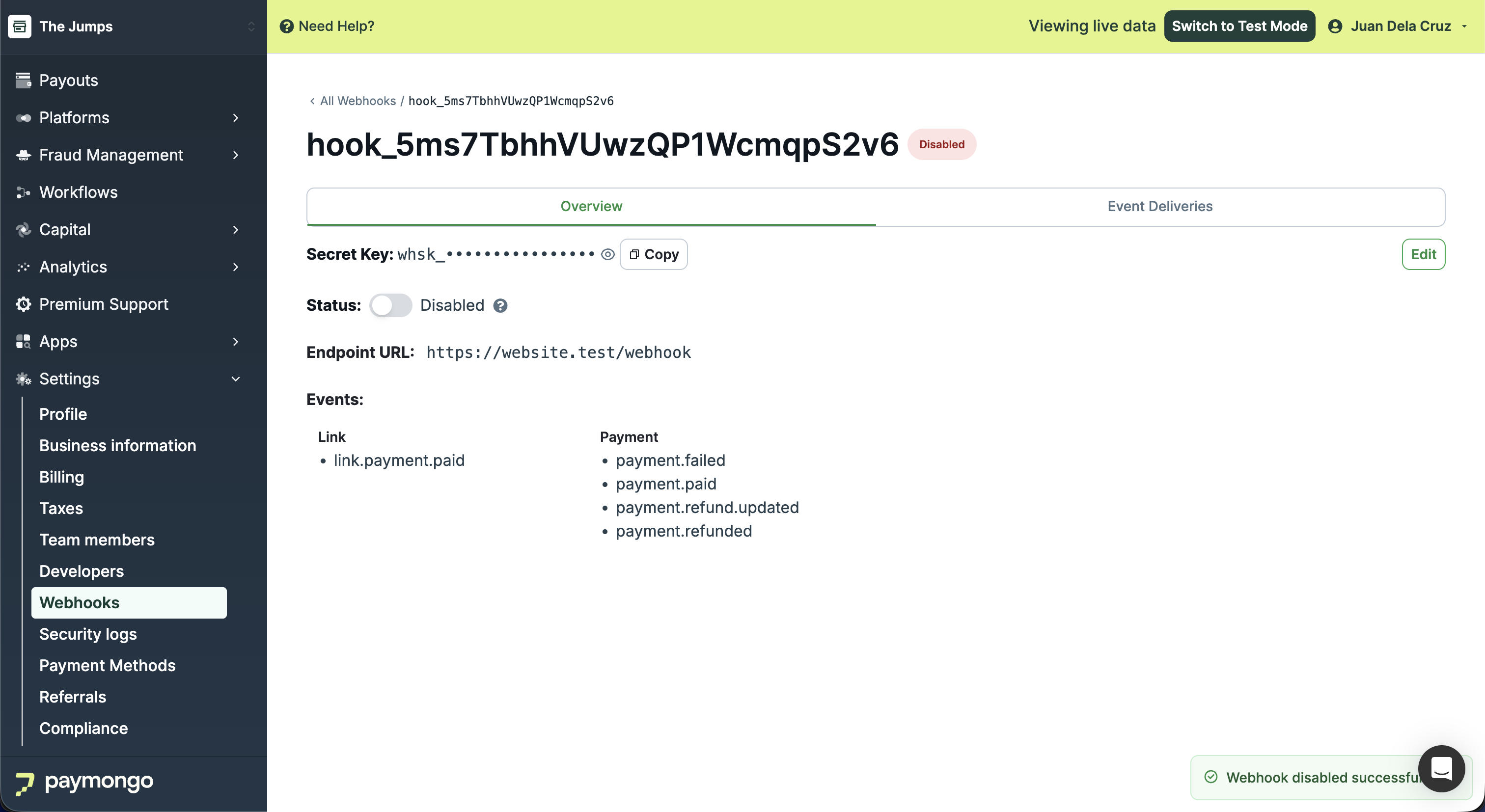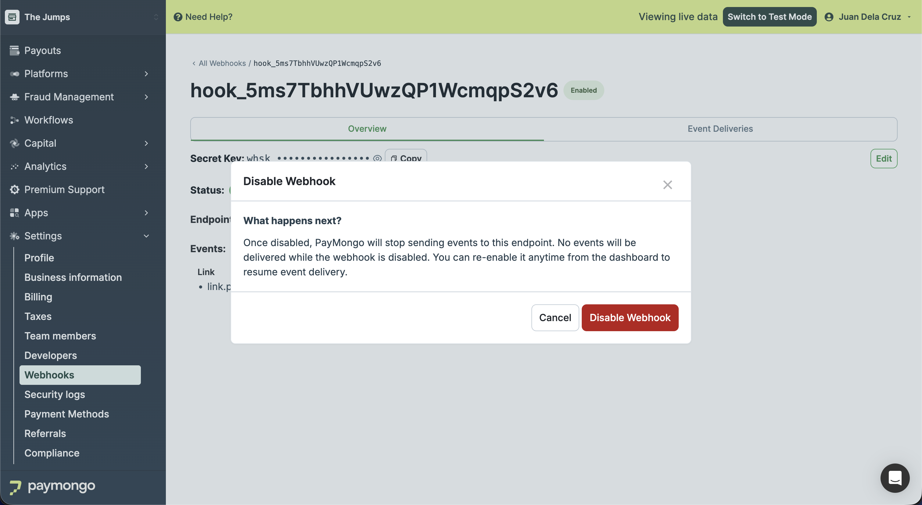 Disable a webhook you no longer need from the Webhooks Module in your PayMongo Dashboard.