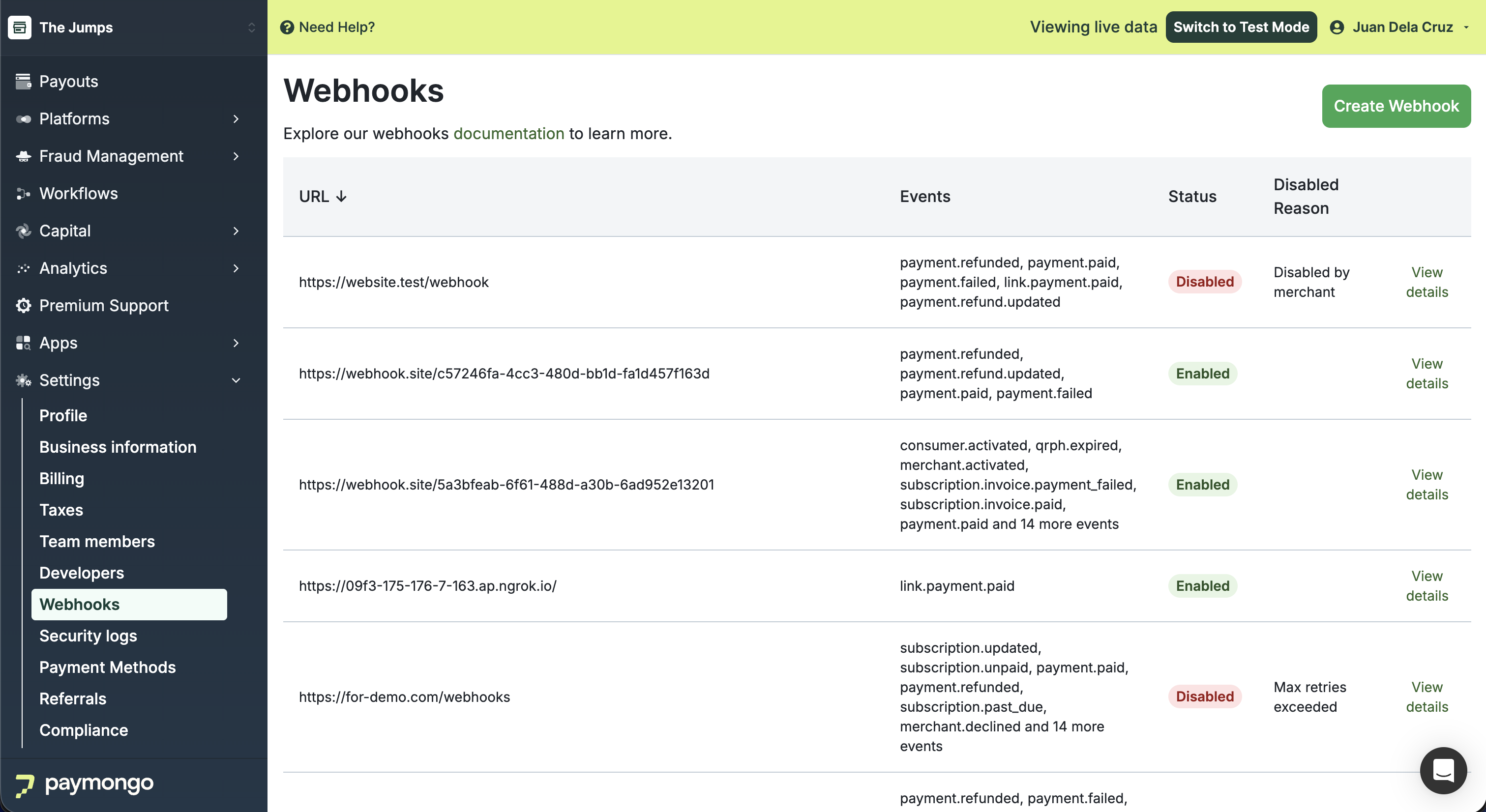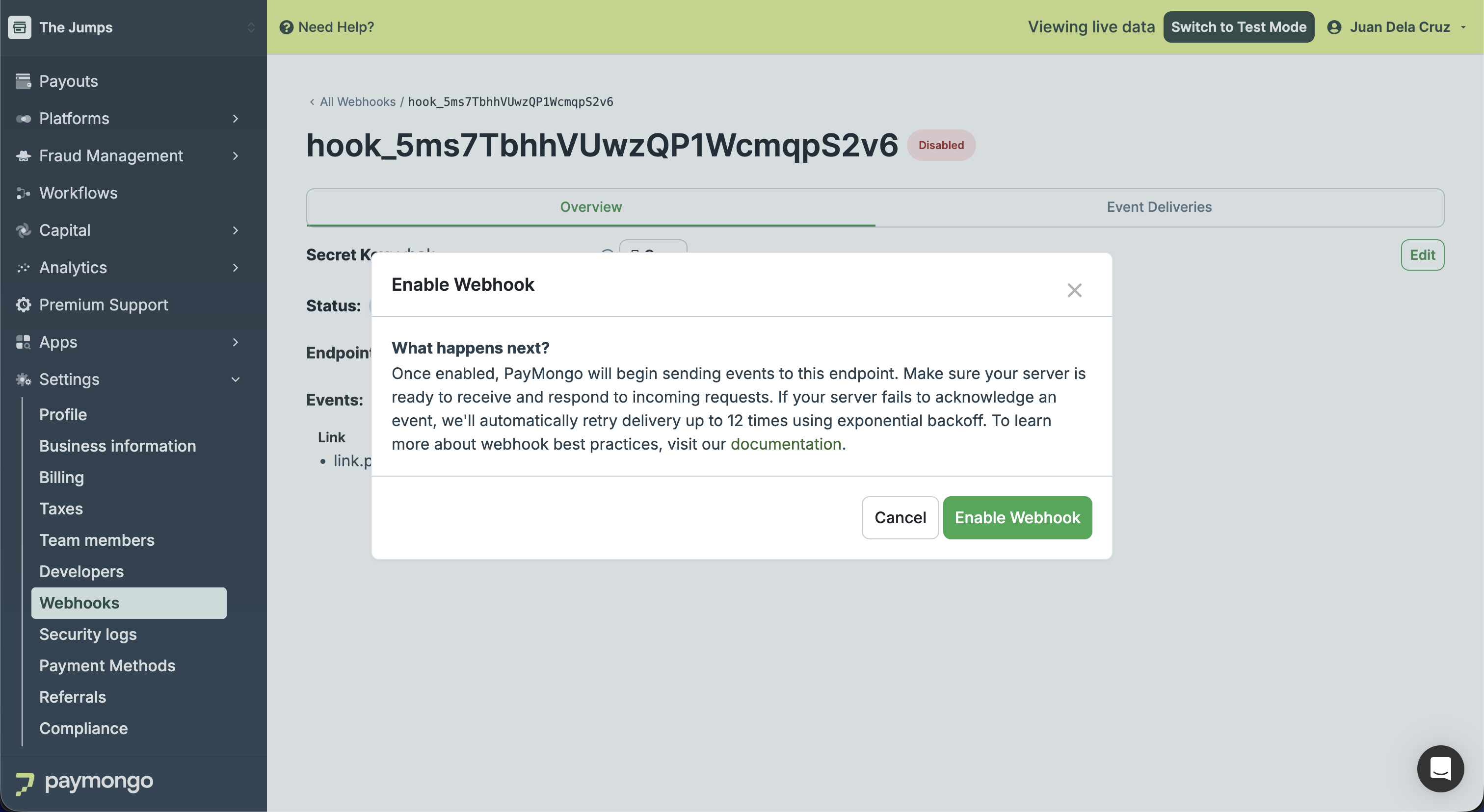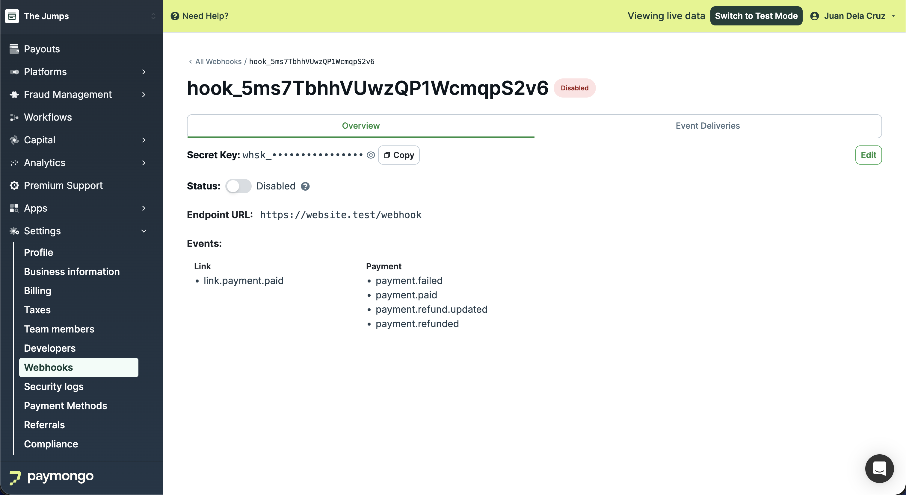 Re-enable a disabled webhook to resume receiving events from the PayMongo Dashboard