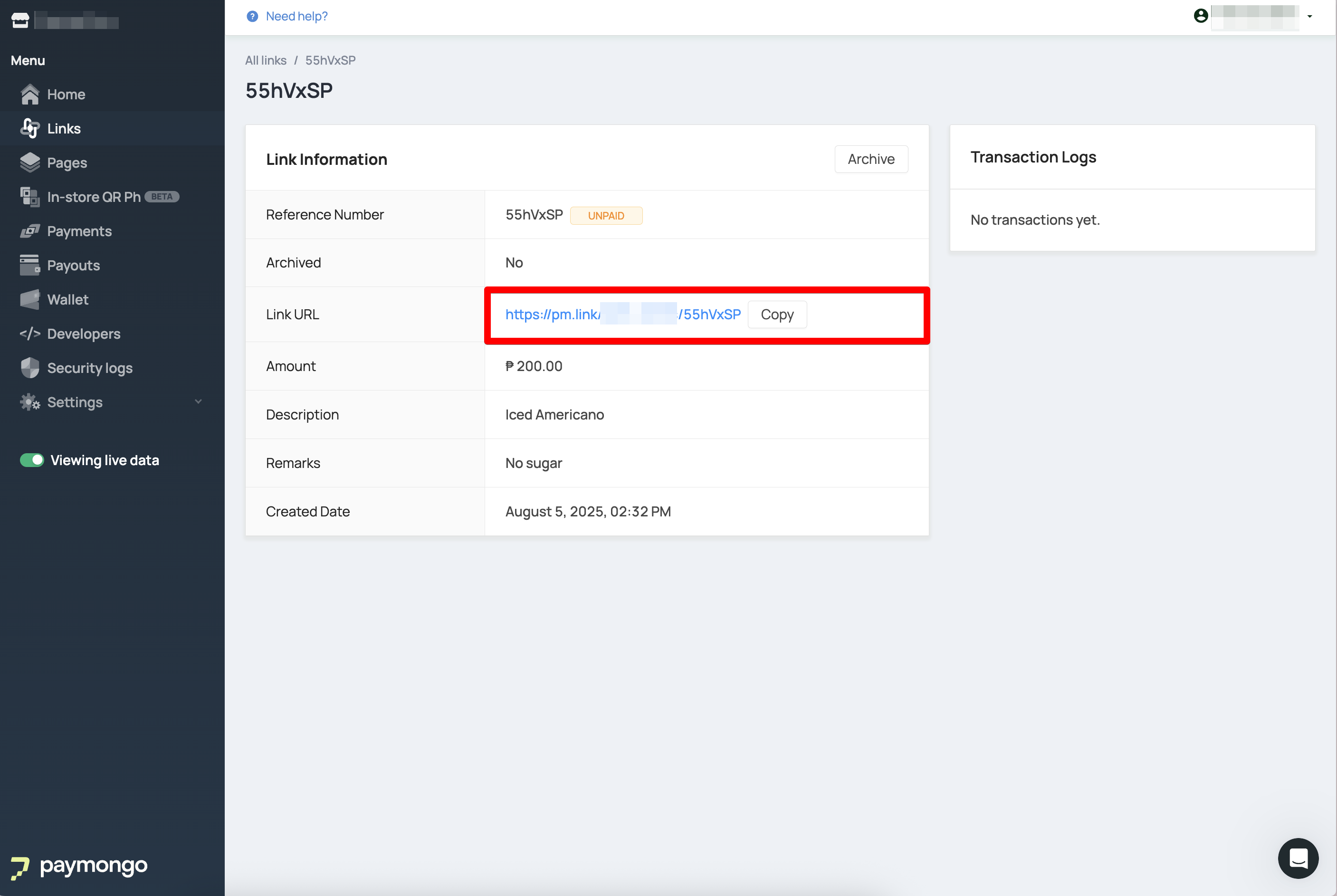 - Navigate to the Links Tab: Log in to your PayMongo Dashboard and click on the 'Links' tab in the sidebar.