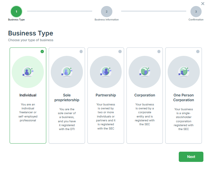 | Payment Methods | Individual (No website) | Individual (With Website) | Sole Proprietor | Partnership | Corporation | One Person Corporation (OPC) |