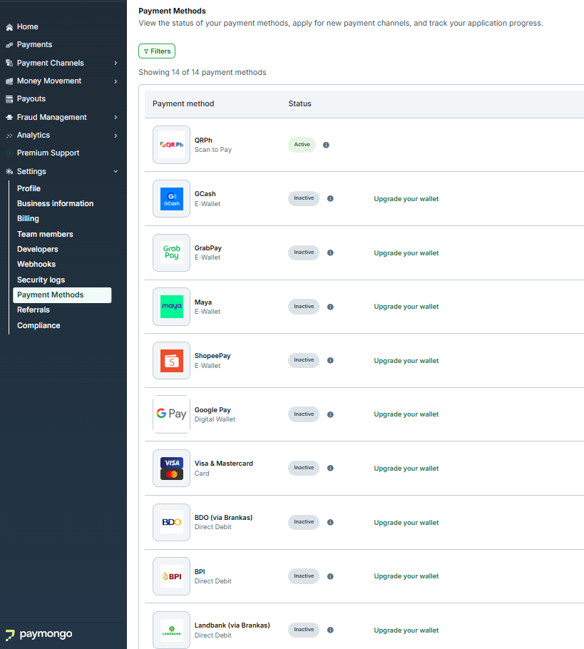 - In your PayMongo Dashboard navigate to your Settings Side Tab > Payment Methods.