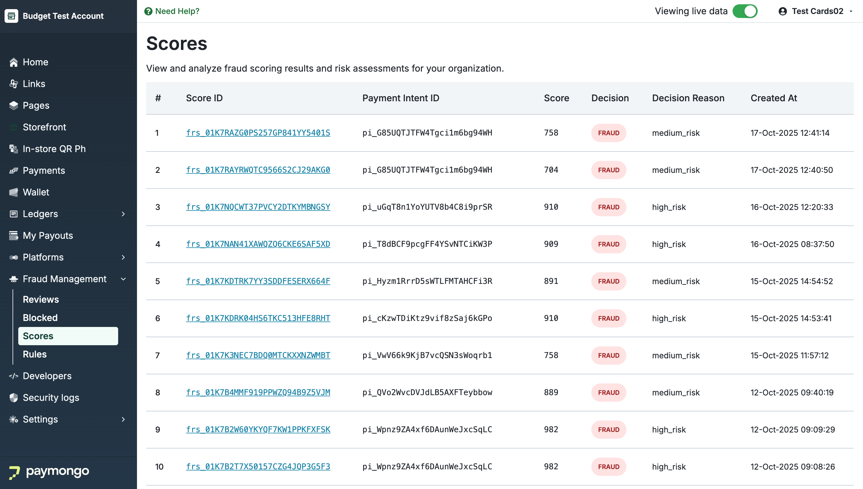 A unique identifier for each fraud risk assessment. Click on the Score ID to view detailed information about the risk evaluation for that transaction. -