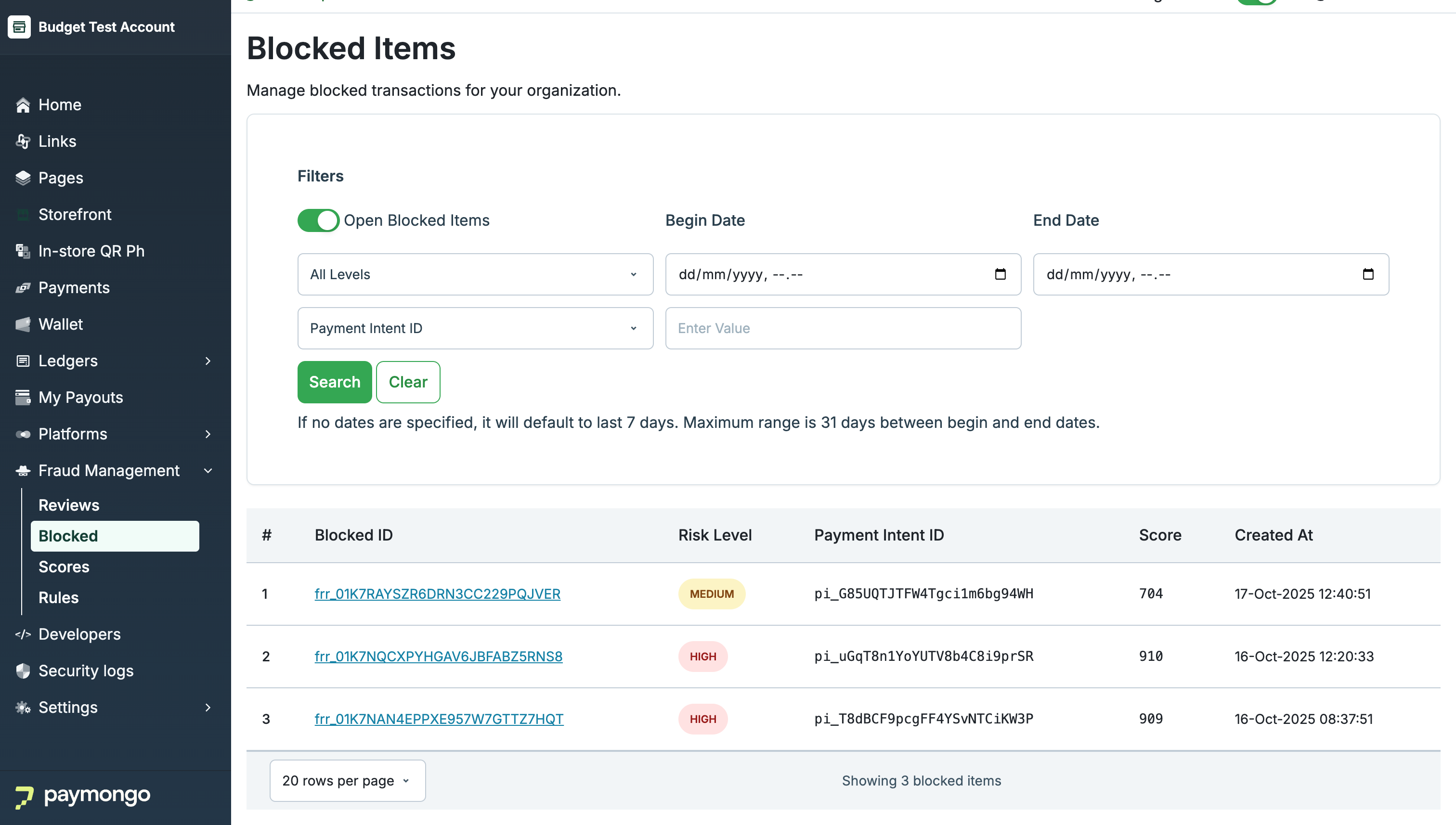 The Blocked section in PayMongo Protect displays a list of transactions that have been automatically declined by your fraud rules. This queue helps your team monitor and analyze transactions that were prevented from being completed due to high fraud risk or other rule-based conditions.