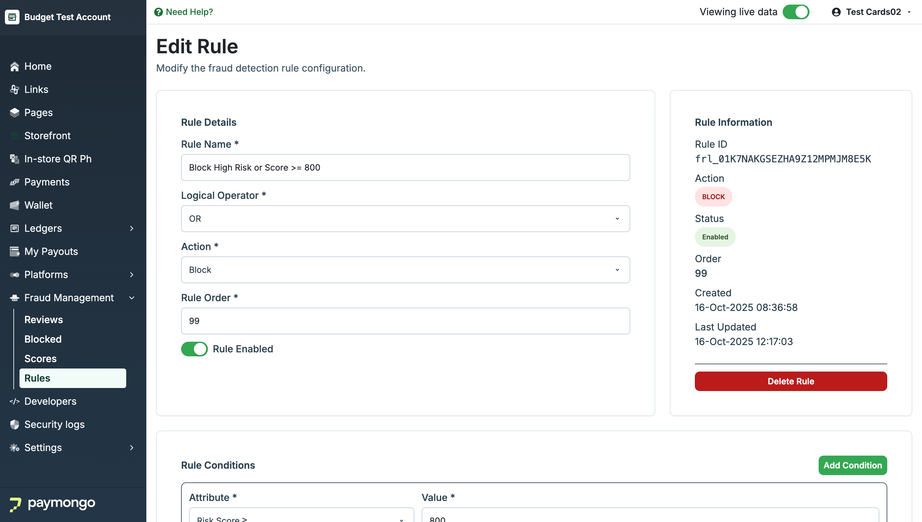 The Edit Rule page in PayMongo Protect enables you to update the configuration of an existing custom fraud detection rule. This interface allows you to modify rule details, logical operators, actions, conditions, and priority order, as well as enable or disable the rule as needed.