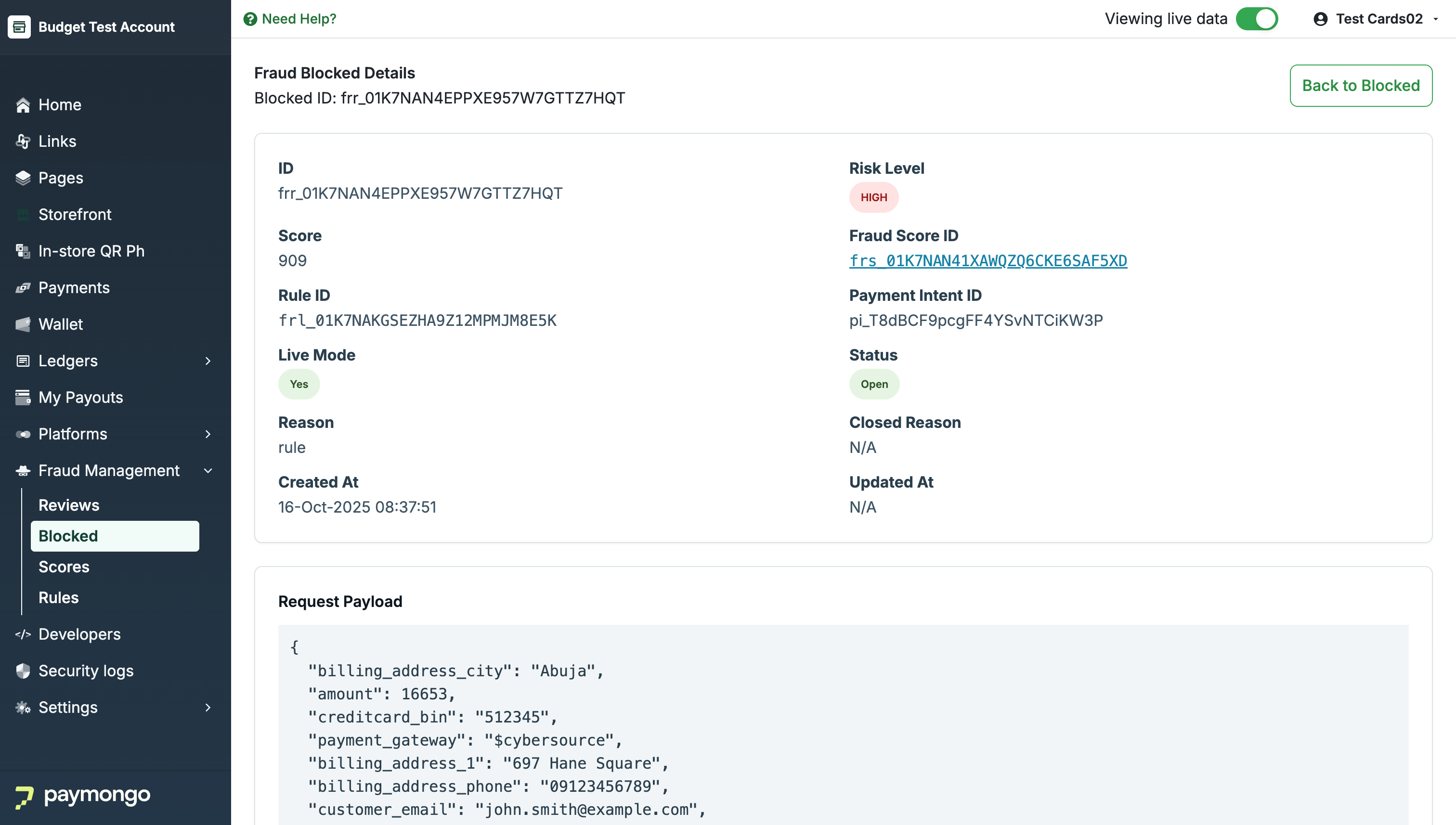 Once you click on a Review ID from the Blocked list, you’ll be taken to the Blocked Detail page. This page provides comprehensive information about the flagged transaction, empowering your team to understand why it was blocked and decide on the appropriate action.