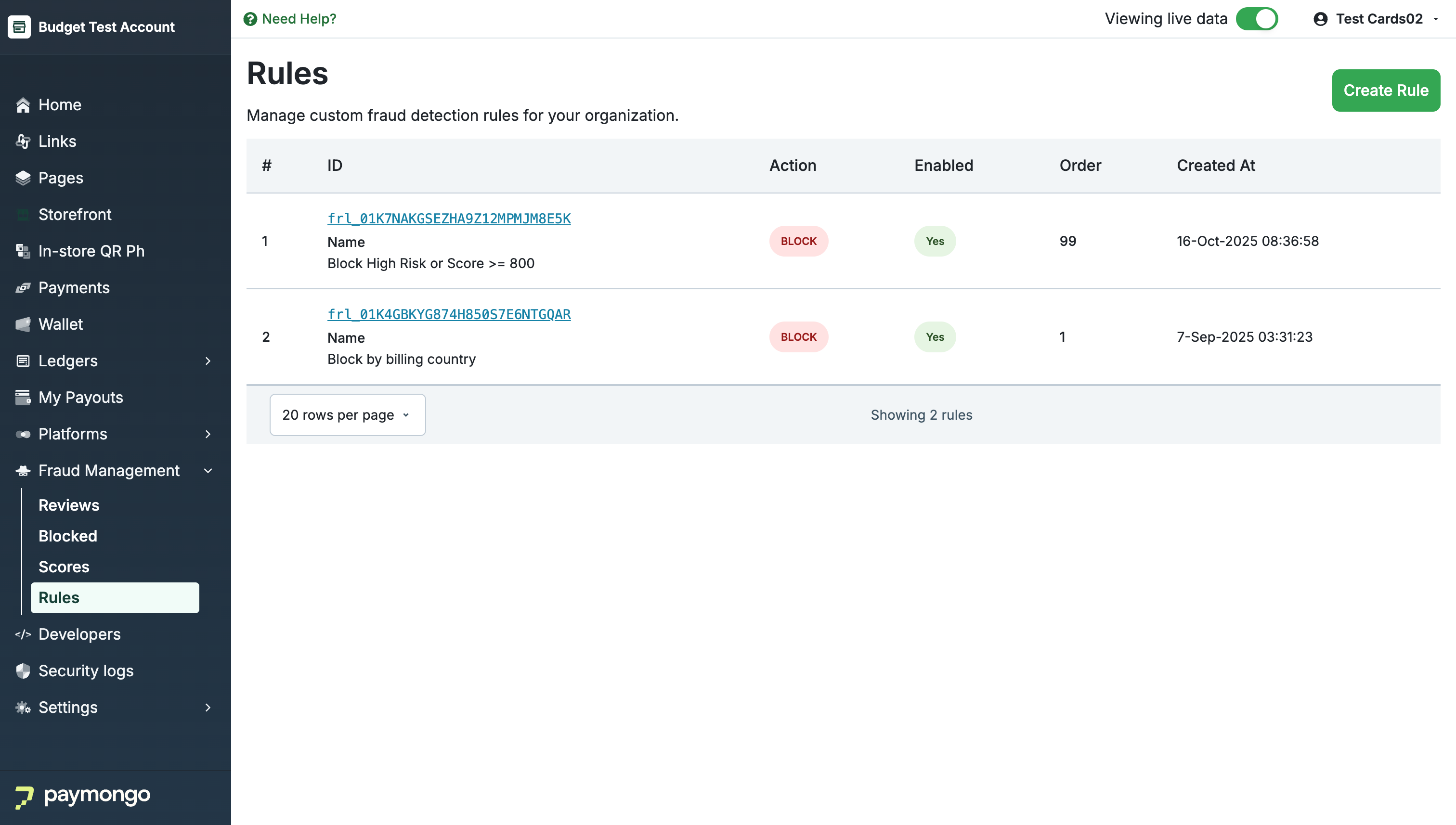 The Rules section in PayMongo Protect gives you complete visibility and control over all the custom fraud detection rules configured for your organization. From this page, you can review, manage, and prioritize rules that automatically block, review, or allow transactions based on your preferred conditions.