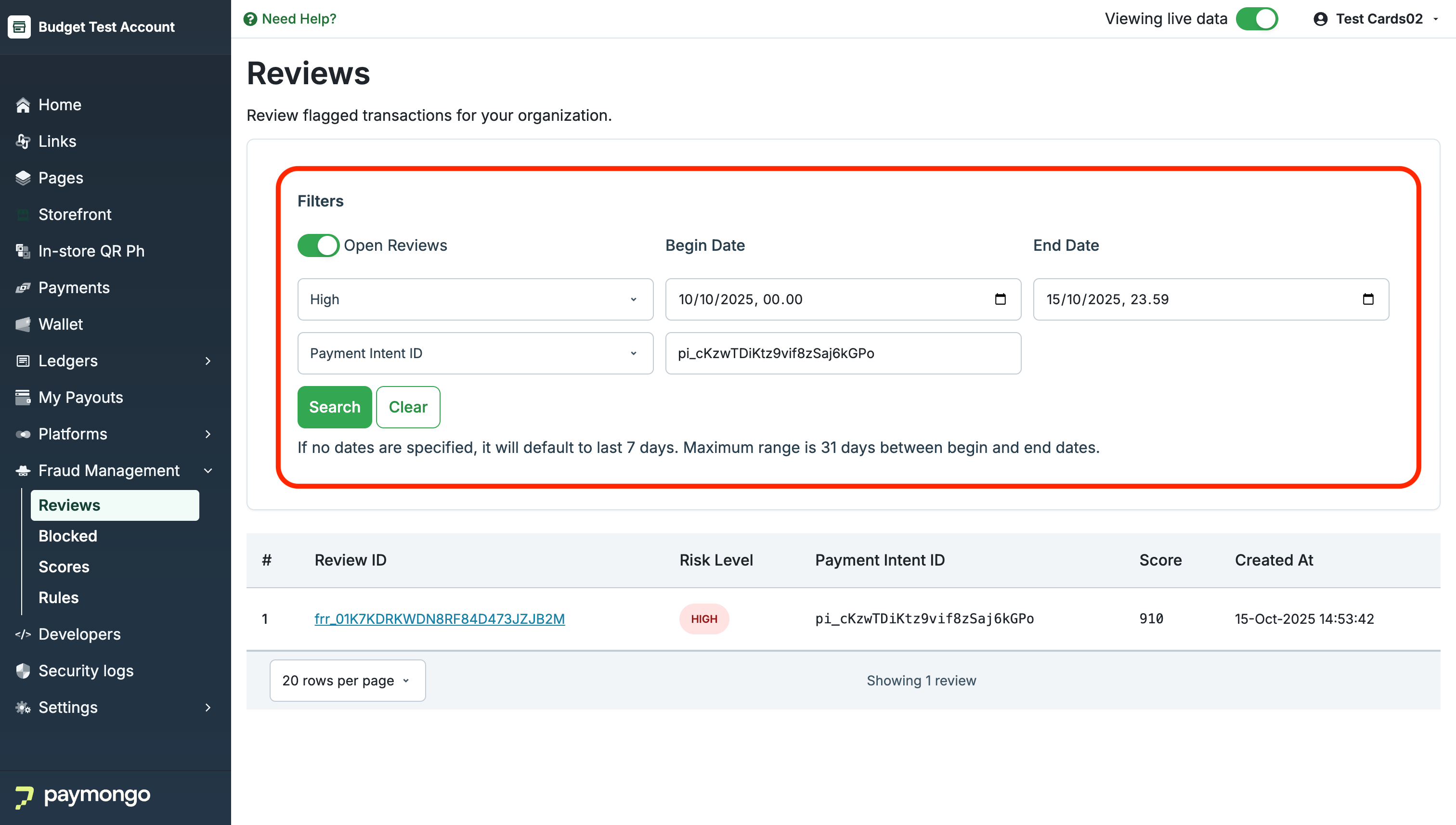 Use one or more filters to define your search. For example, you can filter for "High" risk reviews in the last 7 days, or search for all reviews with a specific Payment Intent ID. -