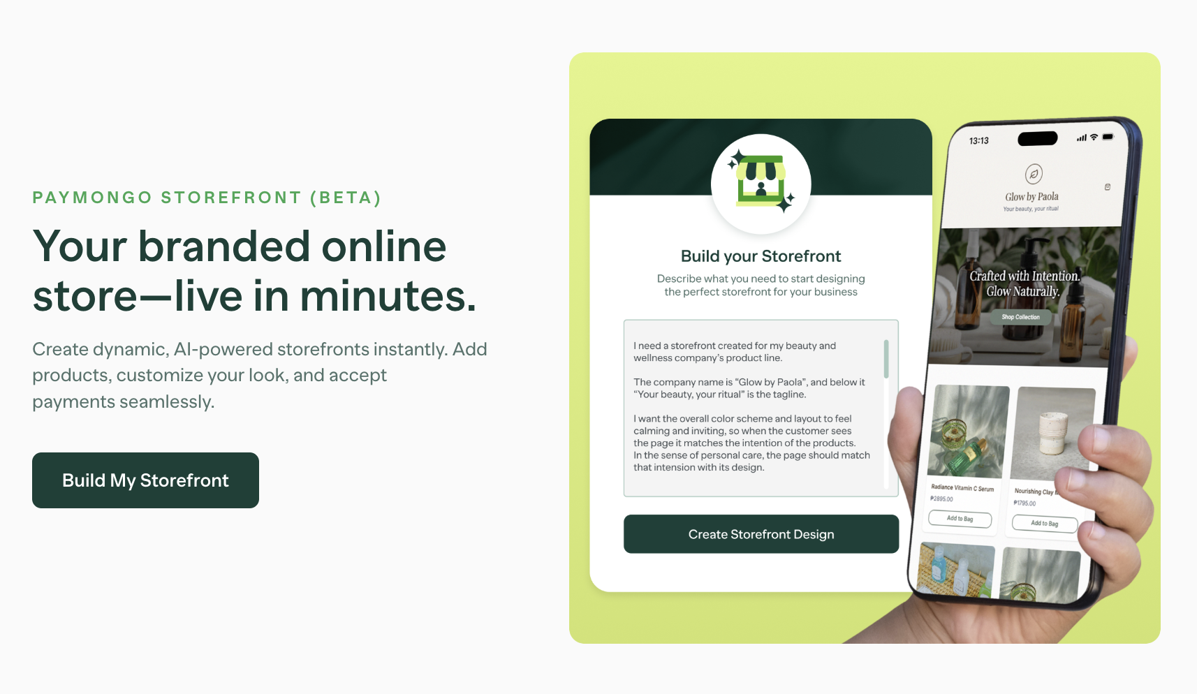 The AI-Generated Storefront is PayMongo's innovative e-commerce solution that enables merchants to create professional, customizable online storefronts through simple AI prompting.