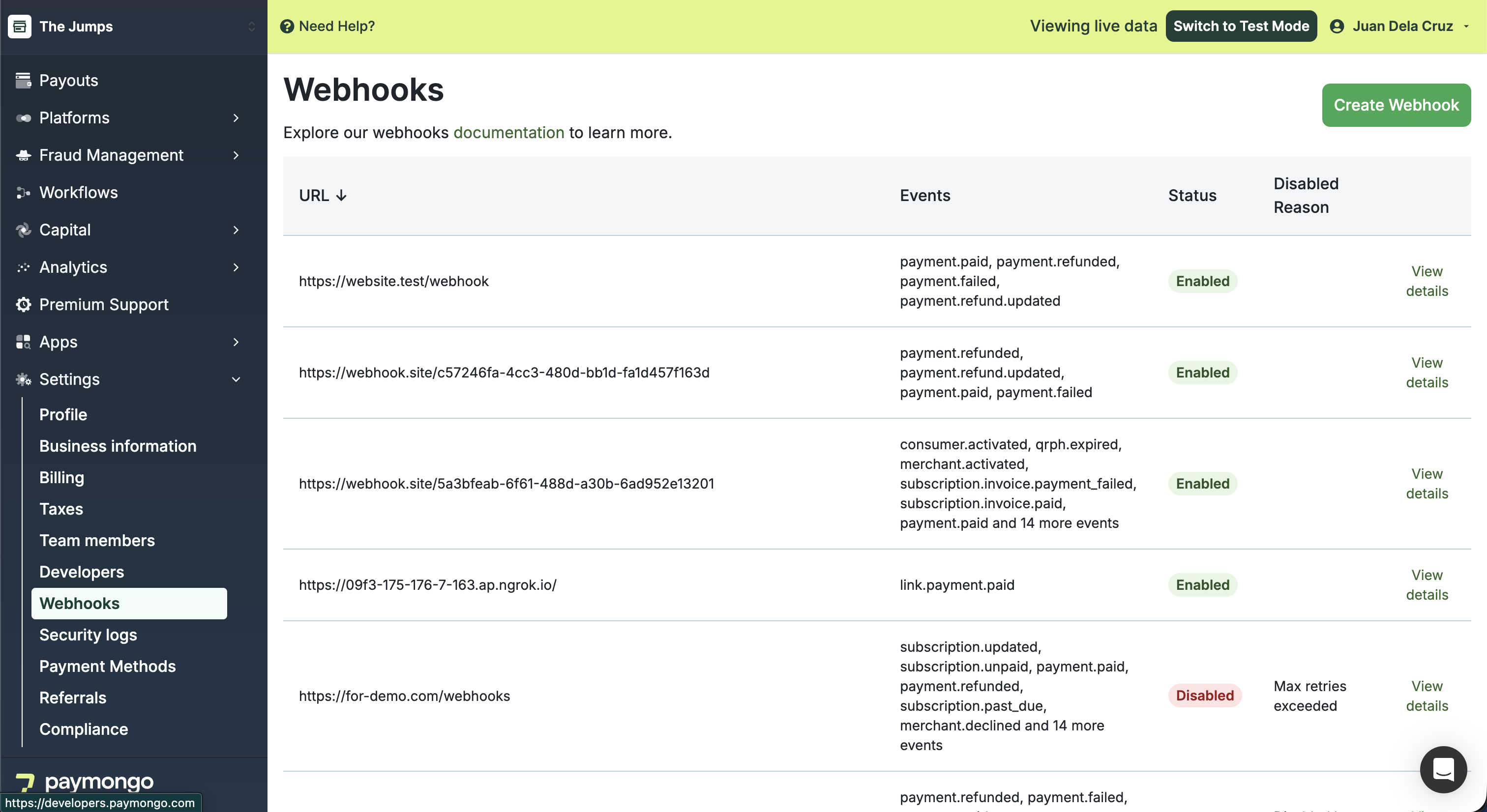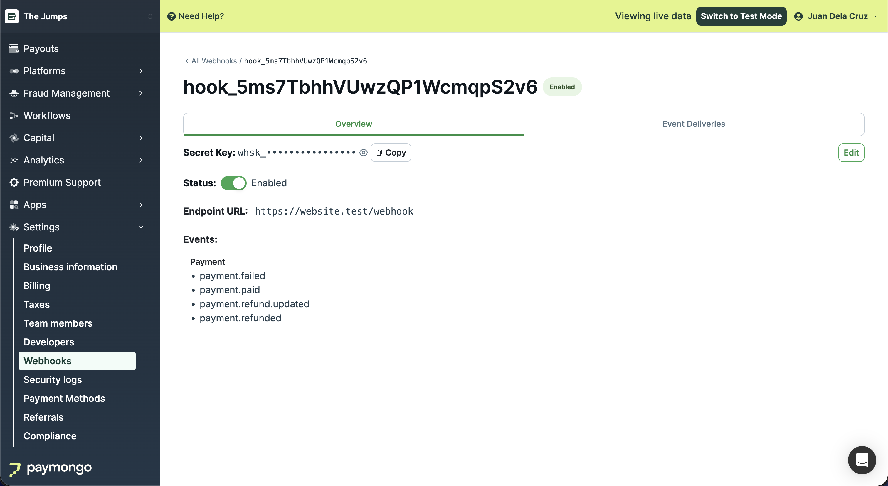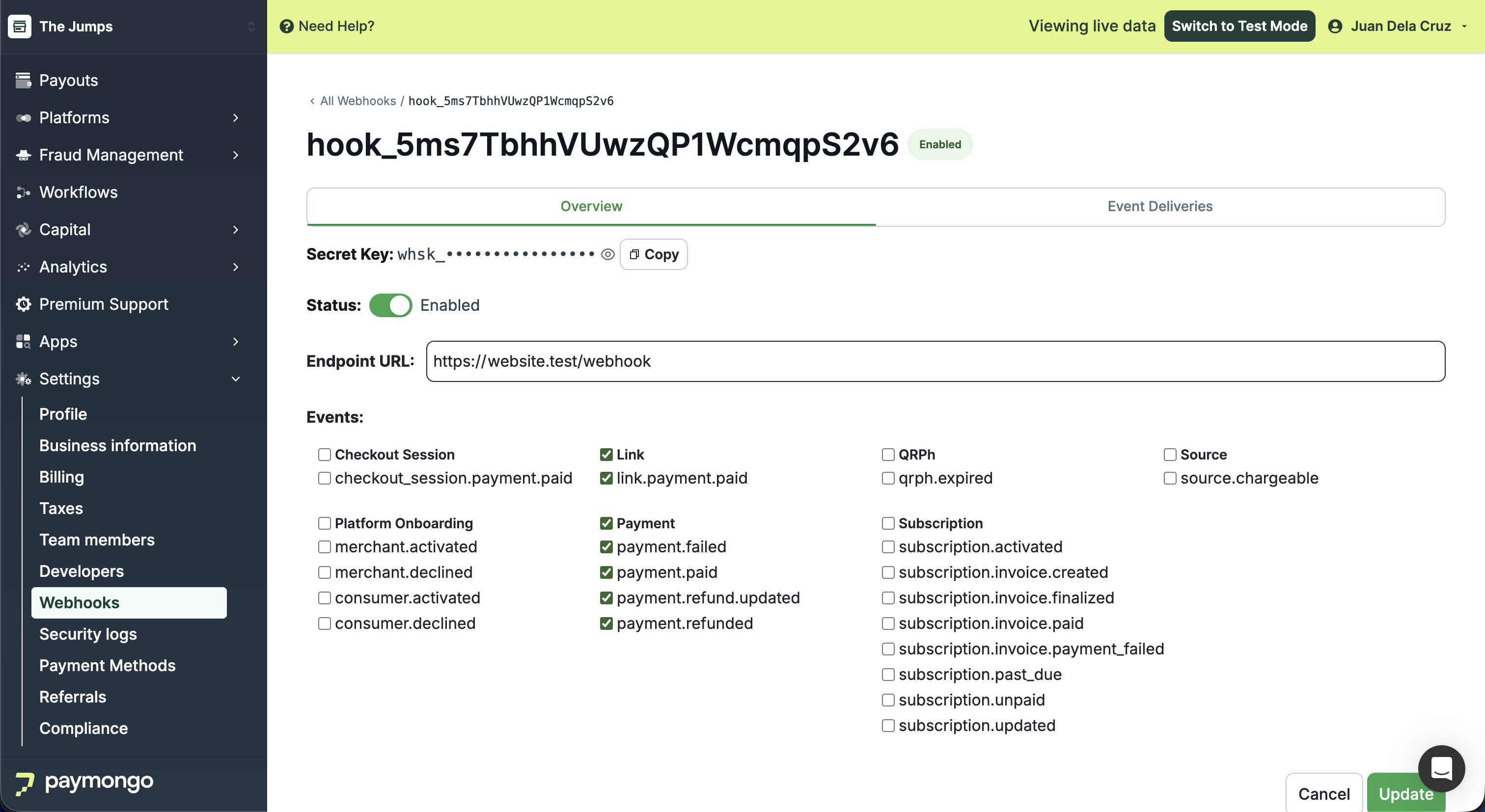 Update an existing webhook's URL or subscribed events from the Webhooks Module in your PayMongo Dashboard.